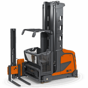 Máquina de tracción eléctrica con conductor que no necesita contrapeso al transportar la carga entre sus ruedas; su longitud total es menor que la de una carretilla contrapesada equivalente por lo que se usa en instalaciones de pasillo estrecho.