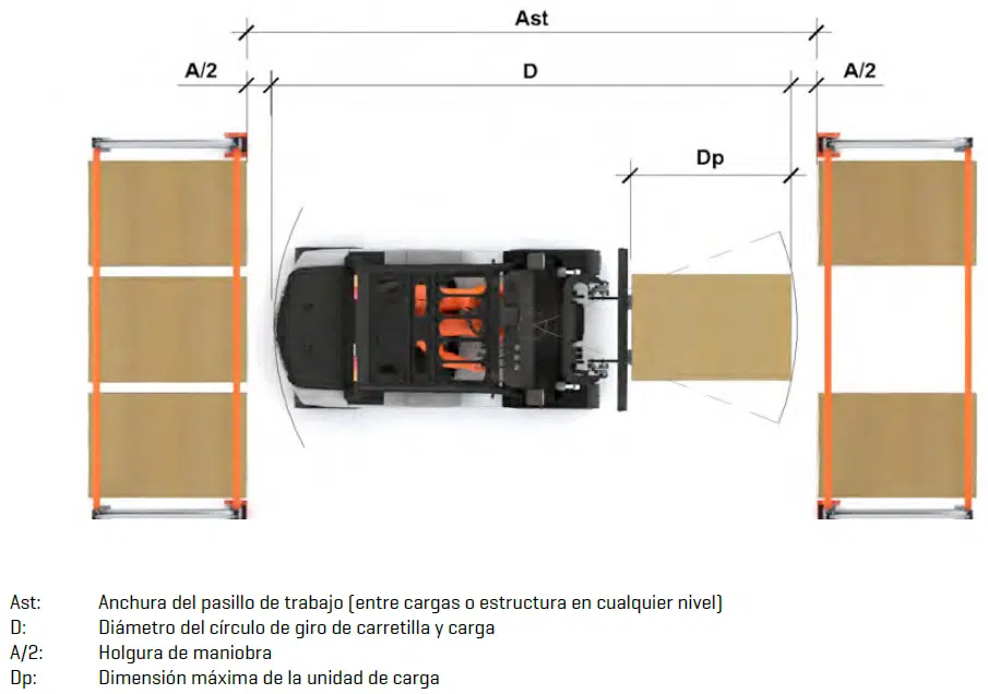 - El pasillo de trabajo debe tener las dimensiones necesarias para permitir que la carretilla gire con su carga con las adecuadas holguras y tolerancias.